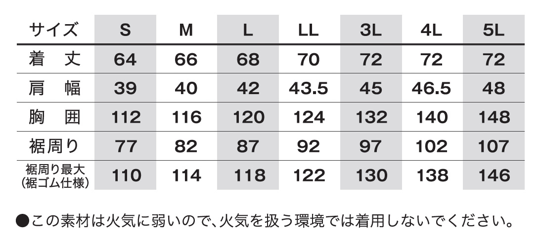 ●この素材は火気に弱いので、火気を扱う環境では着用しないでください。