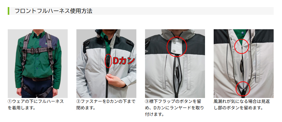 ウェア内側に着用したフルハーネスの背中のDカンを左写真のようにボタンで挟み込むことで、ウェアとハーネスが固定され、脱着がしやすくなります。