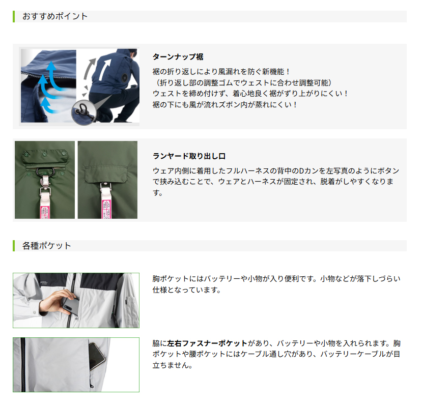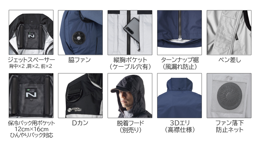 □ブルゾンデザイン:ジェットスペーサー、脇ファン、縦胸ポケット(ケーブル穴有)、ターンナップ裾(風漏れ防止)、ペン差し、保冷パック用ポケット(12cm×16cm・ひんやりパック対応)、Dカン、3Dエリ(高襟仕様)、ファン落下防止ネット、(別売)脱着フード対応