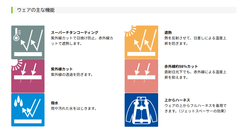□機能:上からハーネス[ジェットスペーサーの効果により、ウェアの上からハーネスを着用できます]