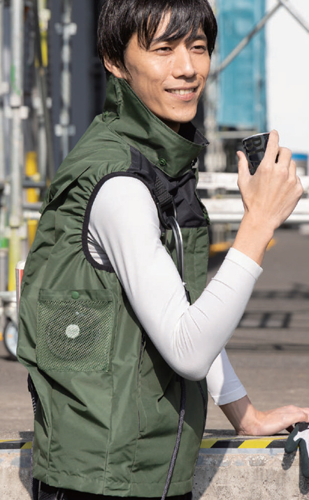▶フルハーネス装着時も腕の可動域を確保。脇ファンタイプで冷却効率と作業性を両立。