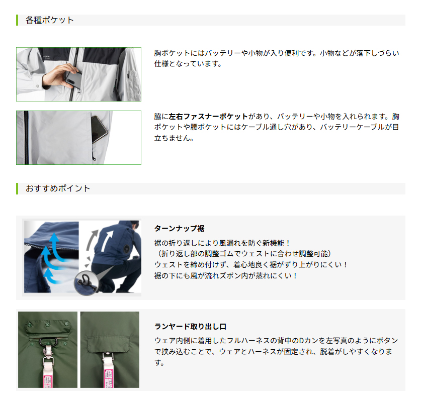 □ブルゾンデザイン:ジェットスペーサー、脇ファン、縦胸ポケット(ケーブル穴有)、ターンナップ裾(風漏れ防止)、ペン差し、保冷パック用ポケット(12cm×16cm・ひんやりパック対応)、Dカン、3Dエリ(高襟仕様)、ファン落下防止ネット、(別売)脱着フード対応