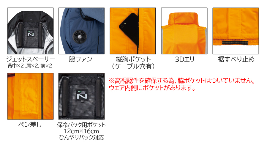 □ブルゾンデザイン:ジェットスペーサー、脇ファン、縦胸ポケット(ケーブル穴有)、3Dエリ、裾すべり止め、ペン差し、保冷パック用ポケット(12cm×16cm・ひんやりパック対応)