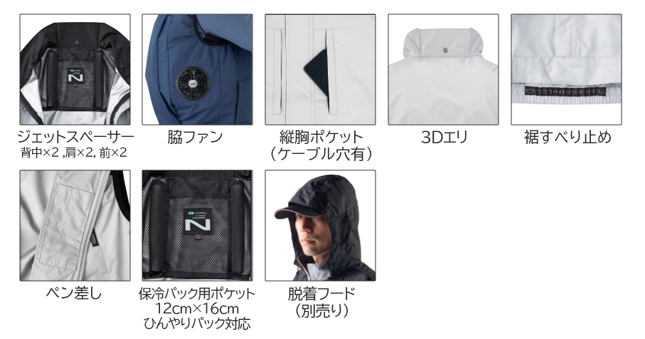 □ブルゾンデザイン:ベスト、ジェットスペーサー、脇ファン、3Dエリ、裾すべり止め、ペン差し、保冷パック用ポケット(12cm×16cm・ひんやりパック対応)、(別売)脱着フード対応