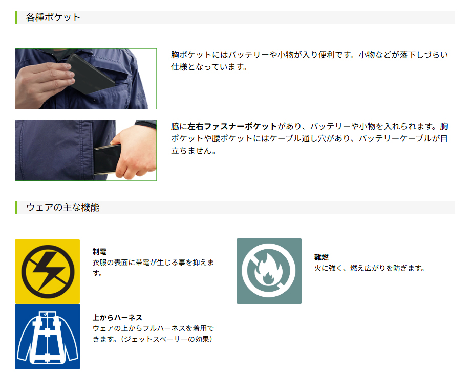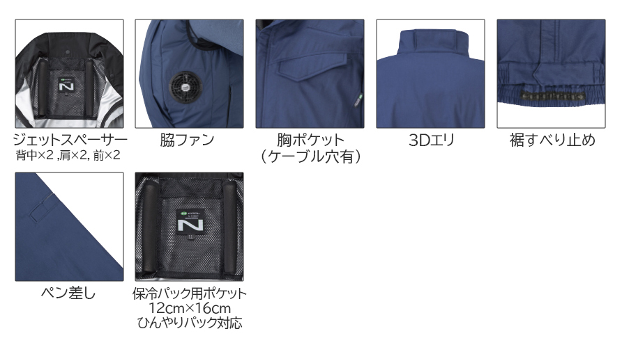□ブルゾンデザイン:長袖ブルゾン、ジェットスペーサージェットスペーサー、脇ファン、胸ポケット(ケーブル穴有)、裾すべり止め、ペン差し、保冷パック用ポケット(12cm×16cm・ひんやりパック対応)