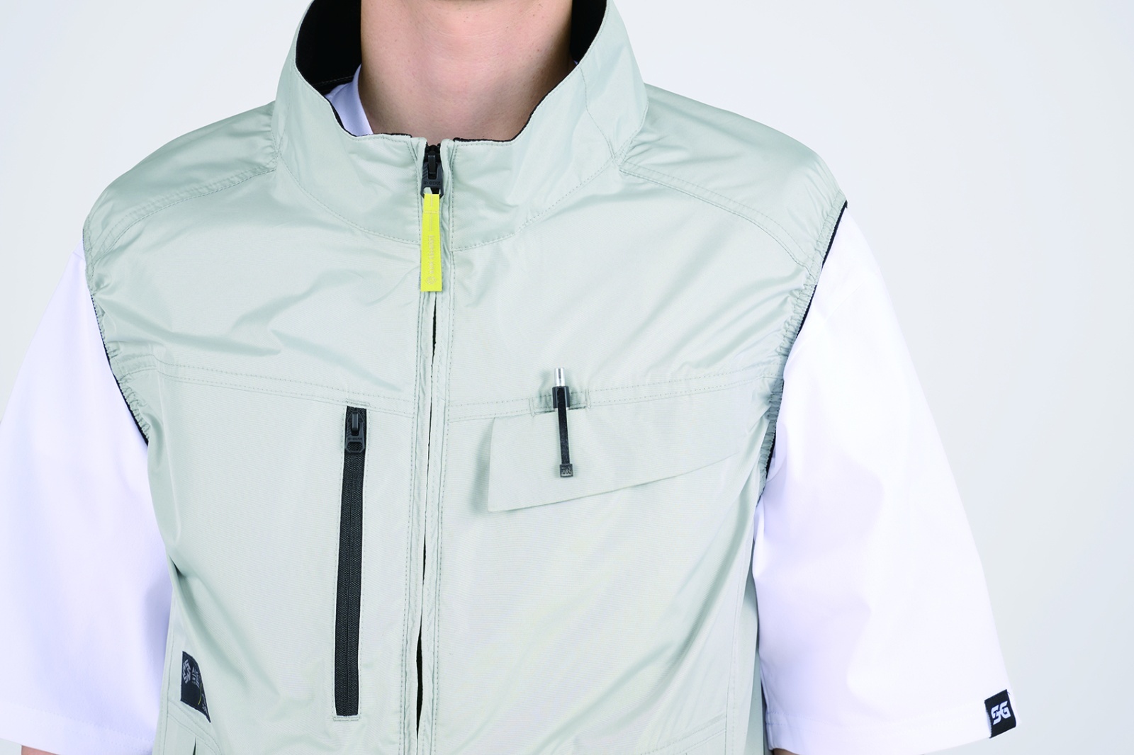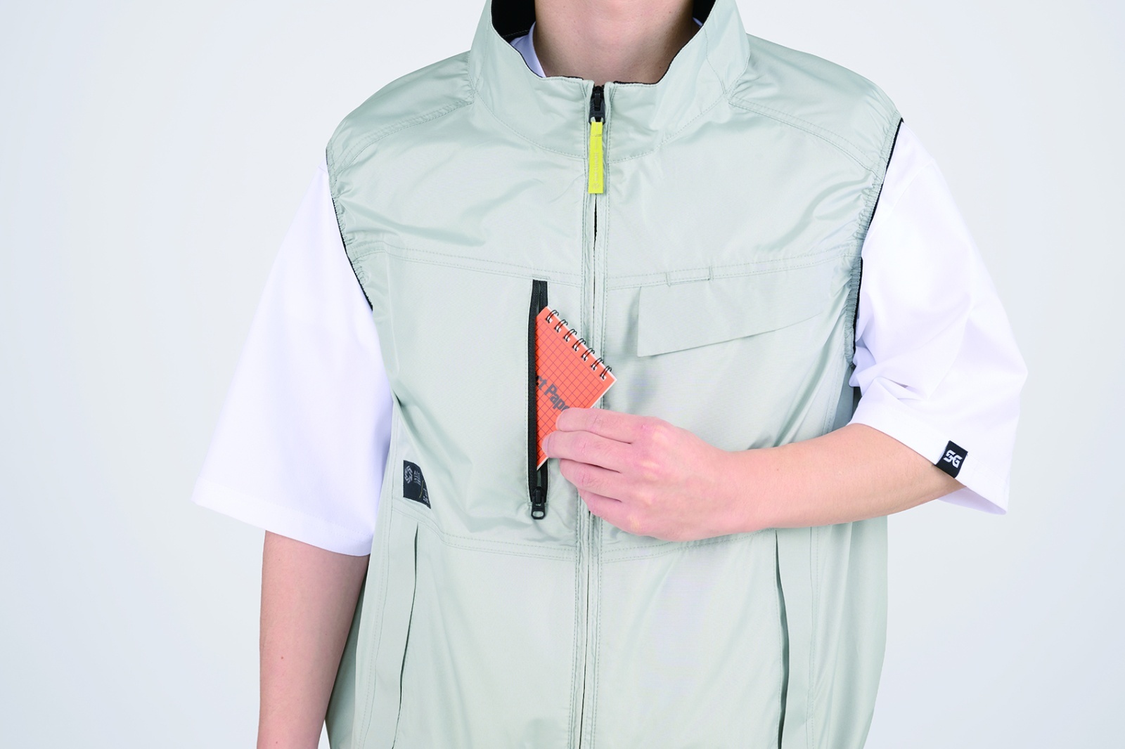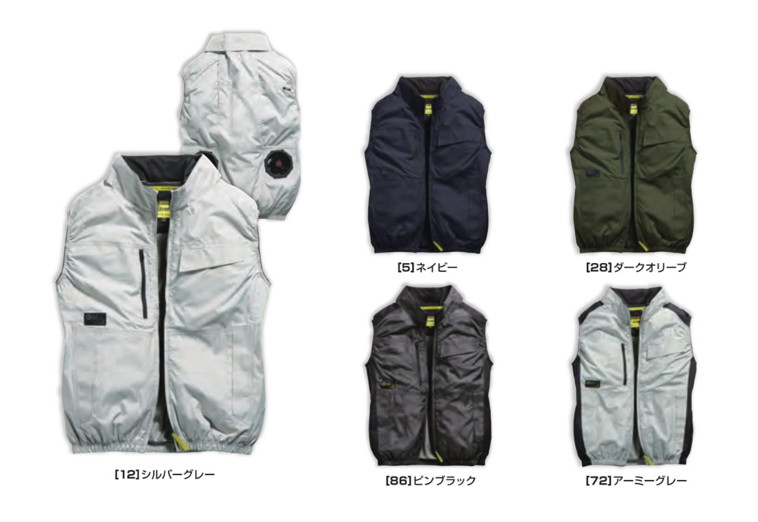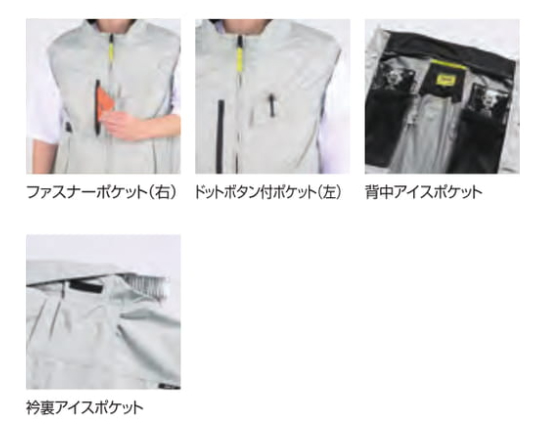 □デザイン:ベスト、ファスナーポケット(右胸)、ドットボタン付ポケット(左胸)、背中アイスポケット、衿裏アイスポケット