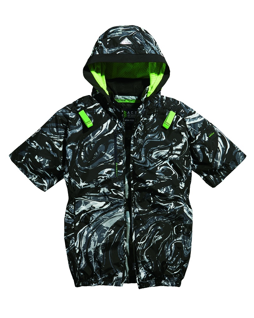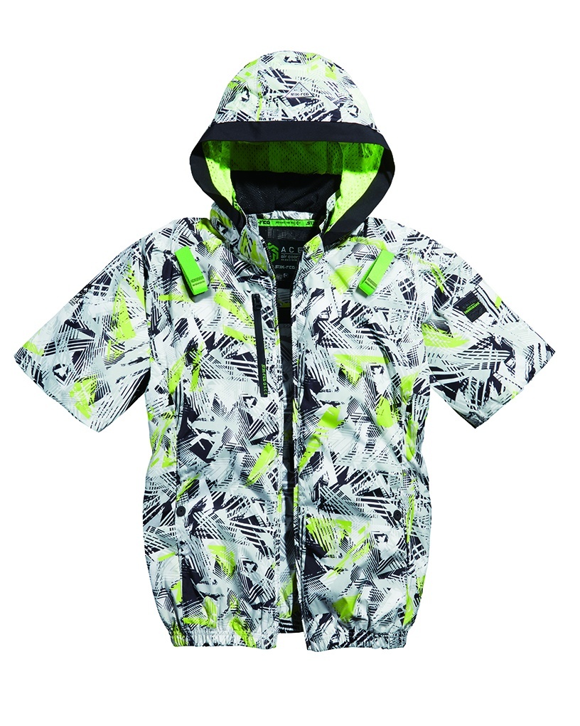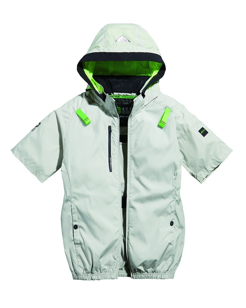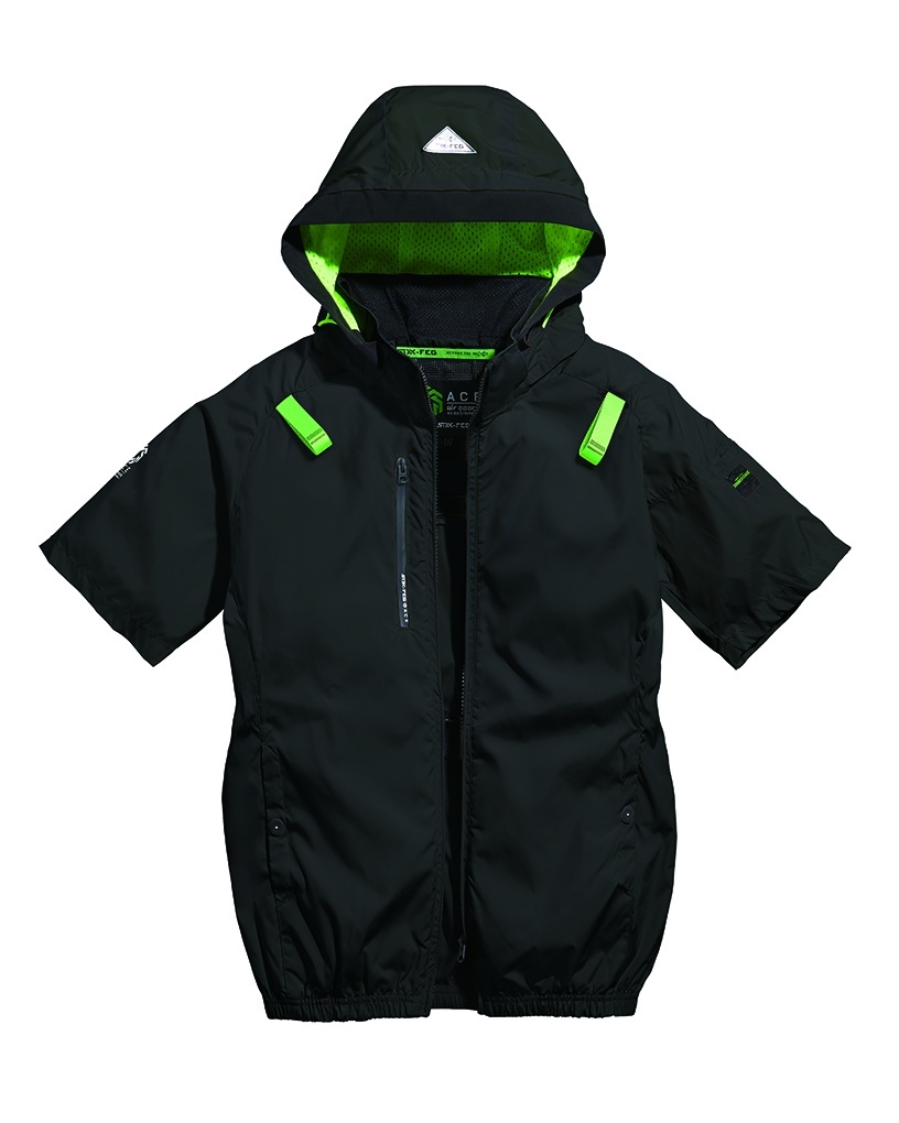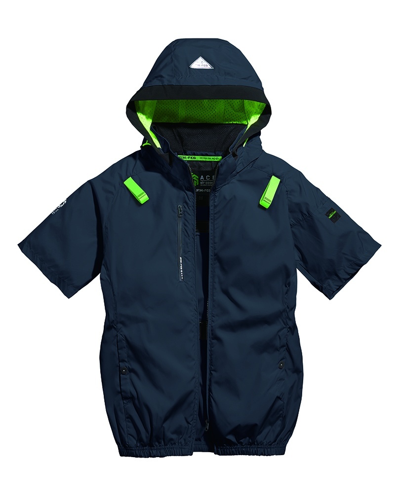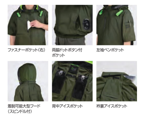 □デザイン:半袖ブルゾン(フルハーネス対応)、両脇サイドファン、着脱可能大型フード(スピンドル付)、右胸ファスナーポケット、両脇ドットボタン付ポケット、左袖ペンポケット、背中アイスポケット、衿裏アイスポケット、ランヤード取付口