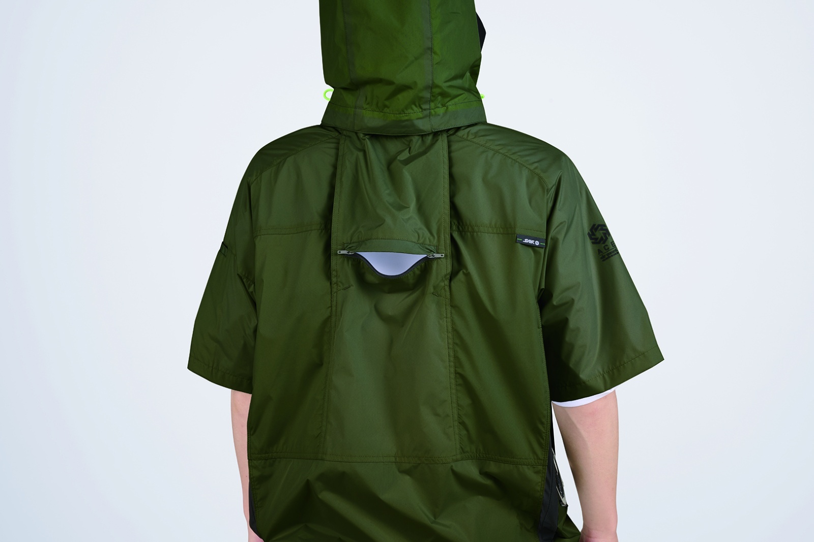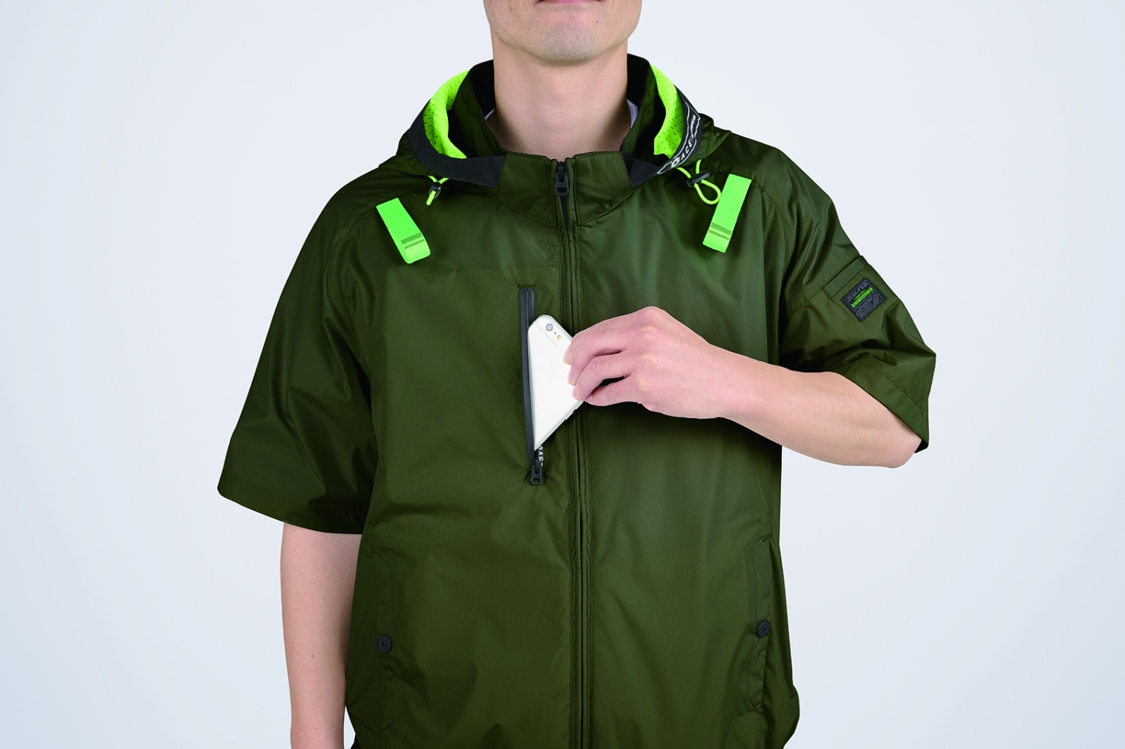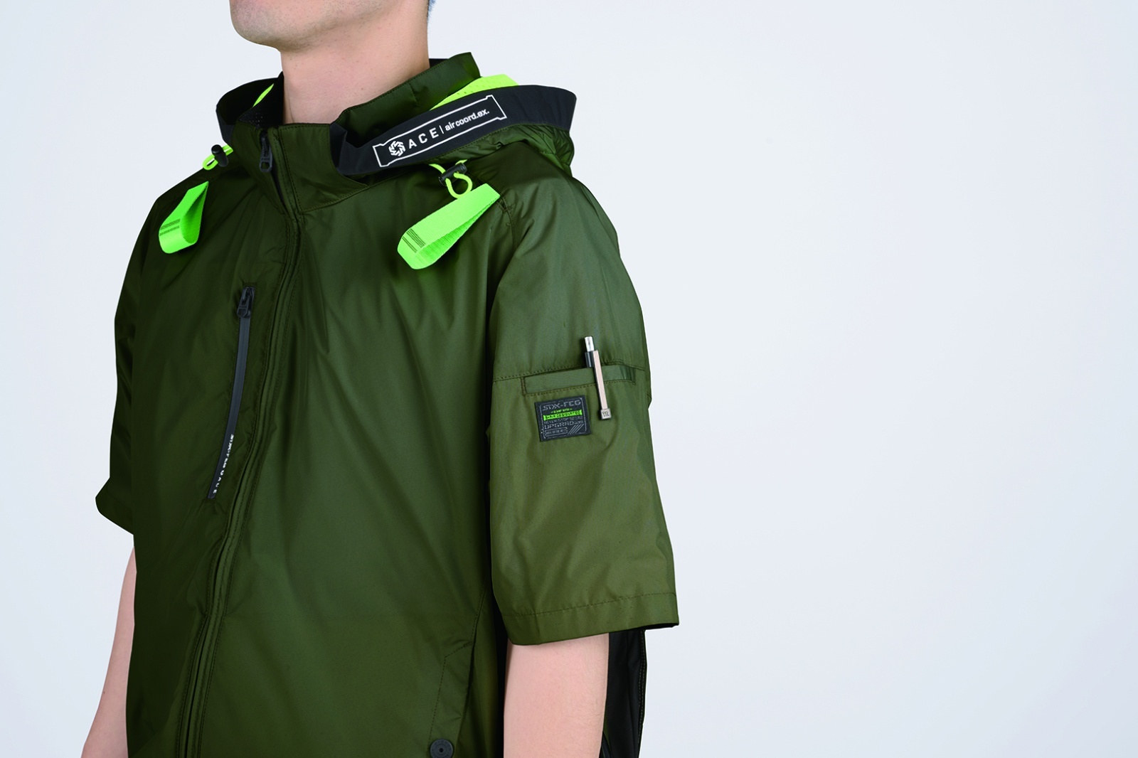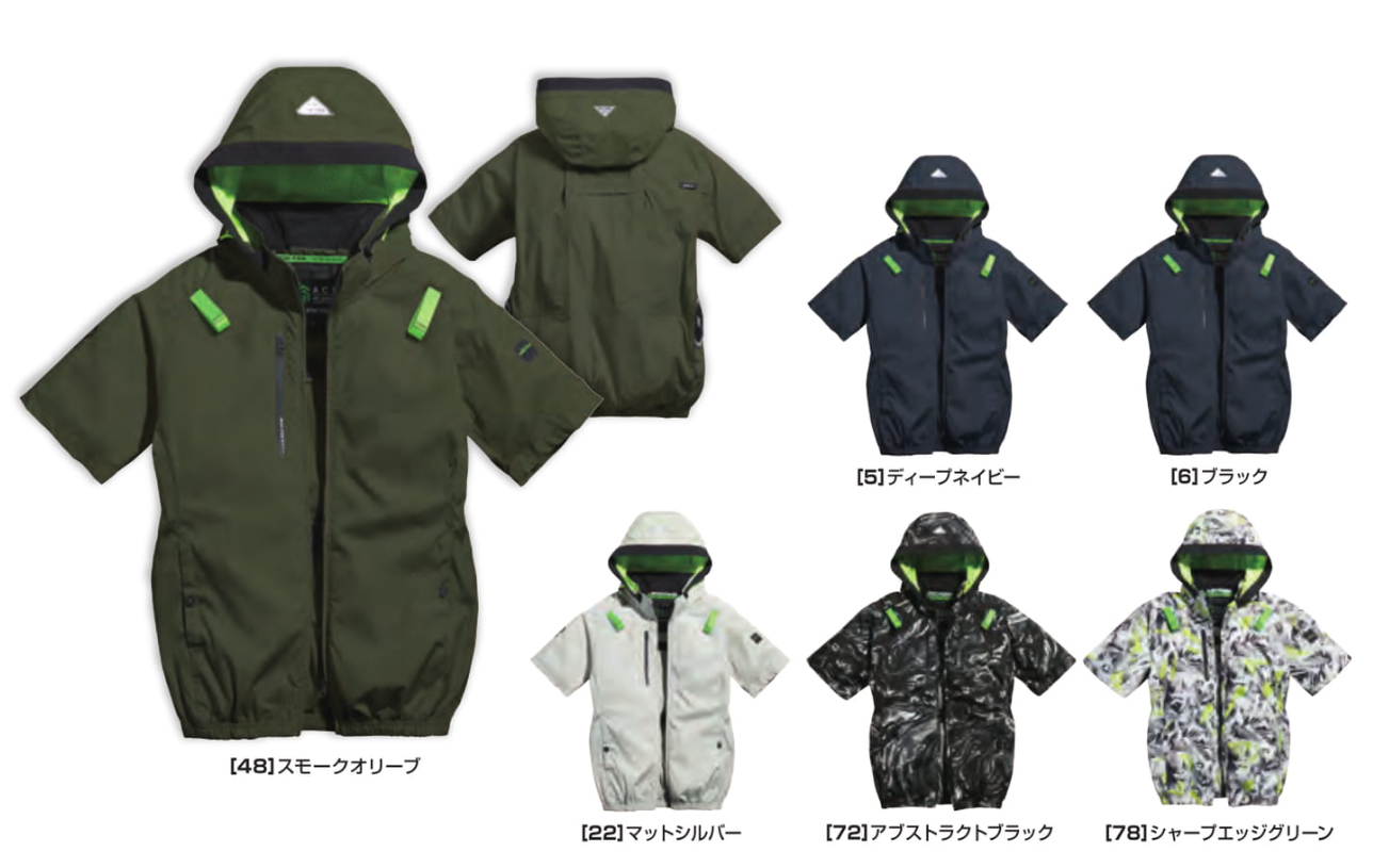 □デザイン:半袖ブルゾン(フルハーネス対応)、両脇サイドファン、着脱可能大型フード(スピンドル付)、右胸ファスナーポケット、両脇ドットボタン付ポケット、左袖ペンポケット、背中アイスポケット、衿裏アイスポケット、ランヤード取付口