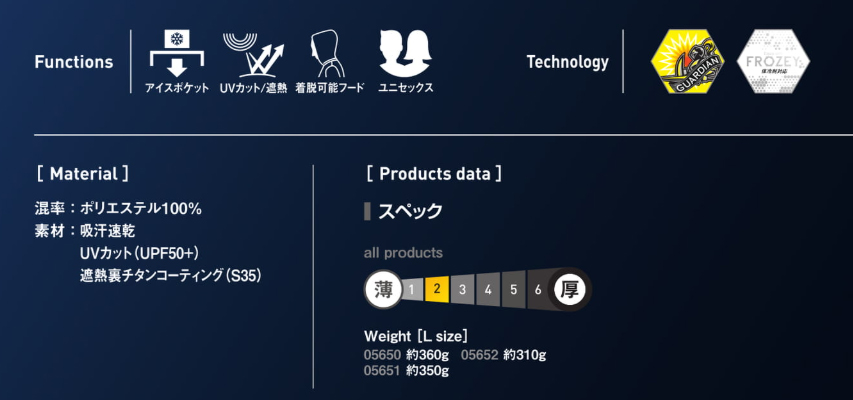 □機能:吸汗速乾、UVカット(UPF50⁺)、遮熱裏チタンコーティング(S35)