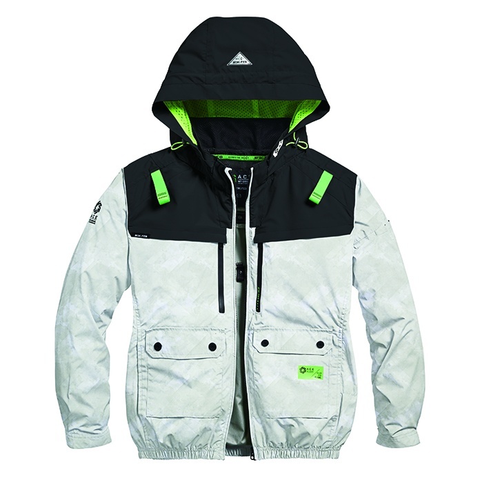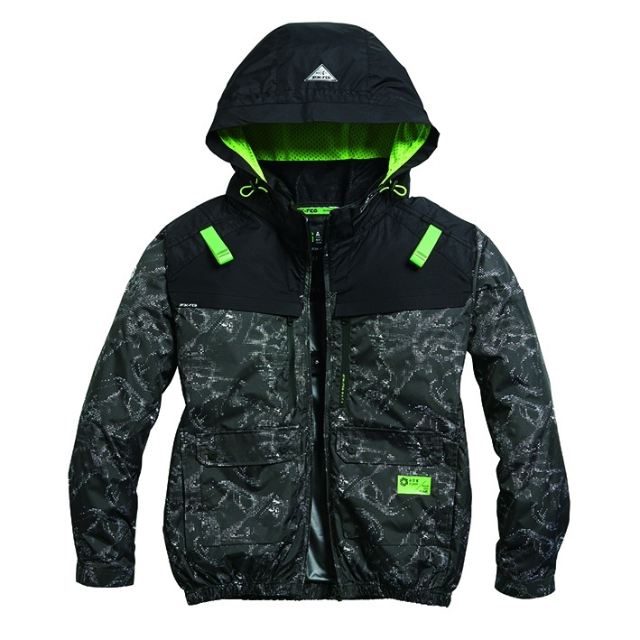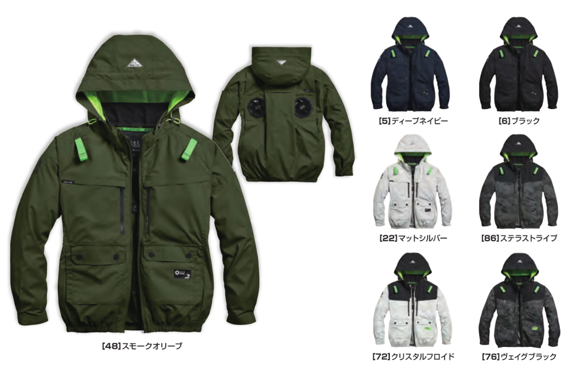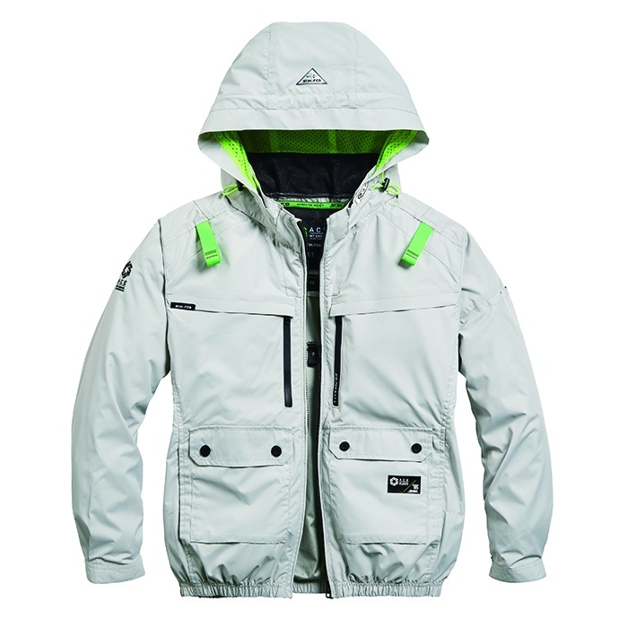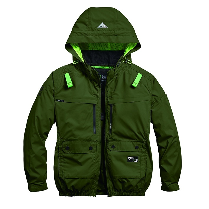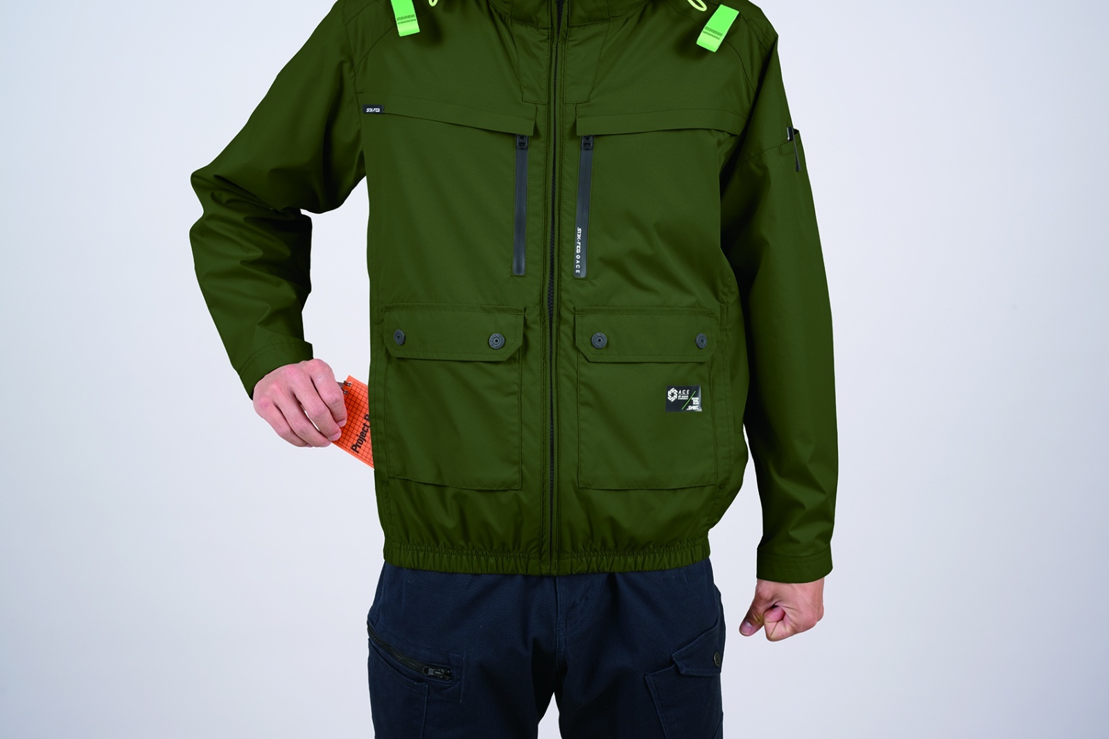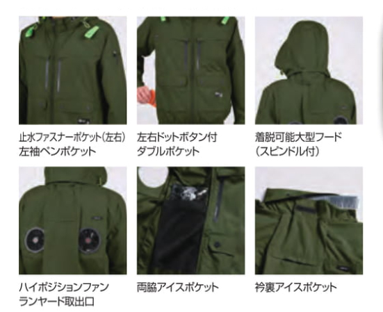 □デザイン:長袖ブルゾン(フルハーネス対応)、ハイポジション(上部)ファン、ランヤード取付口、着脱可能大型フード(スピンドル付)、左右止水ファスナーポケット、左袖ペンポケット、左右ドットボタン付ダブルポケット、両脇アイスポケット、衿裏アイスポケット