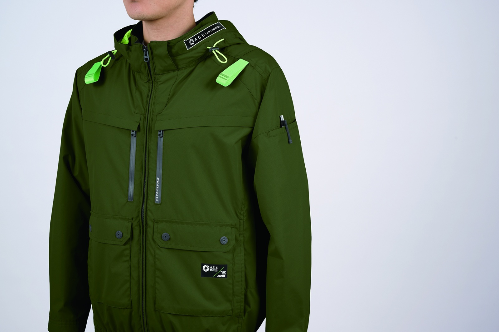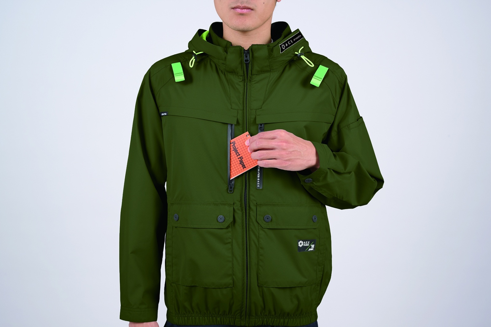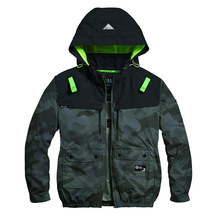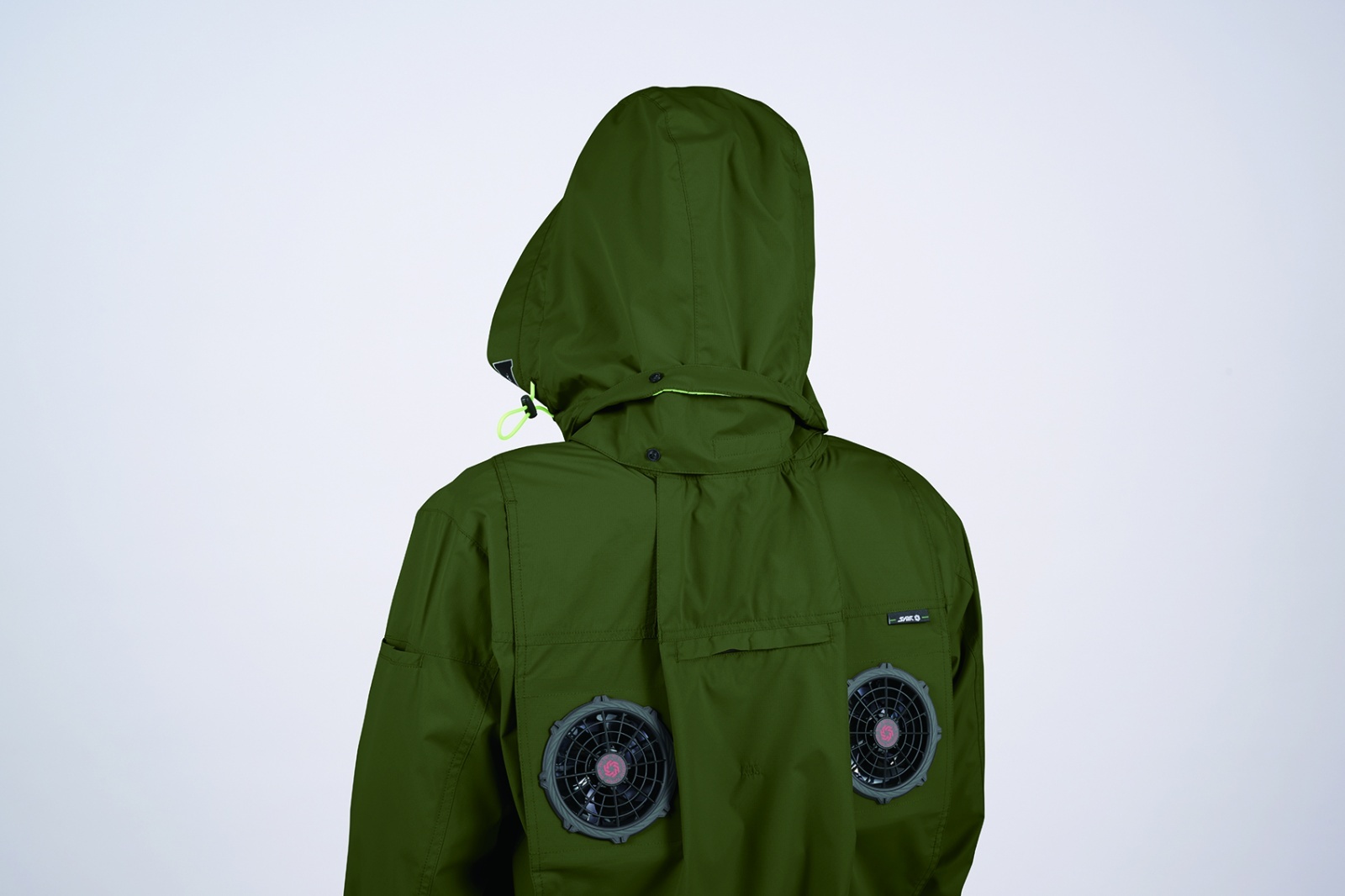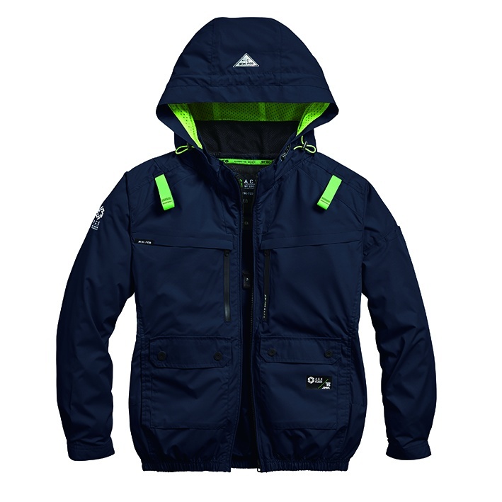 □デザイン:長袖ブルゾン(フルハーネス対応)、ハイポジション(上部)ファン、ランヤード取付口、着脱可能大型フード(スピンドル付)、左右止水ファスナーポケット、左袖ペンポケット、左右ドットボタン付ダブルポケット、両脇アイスポケット、衿裏アイスポケット