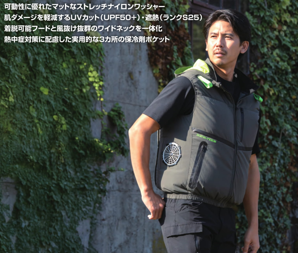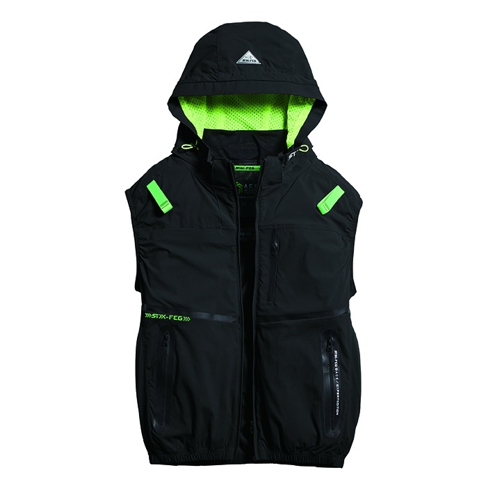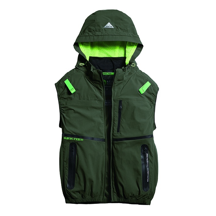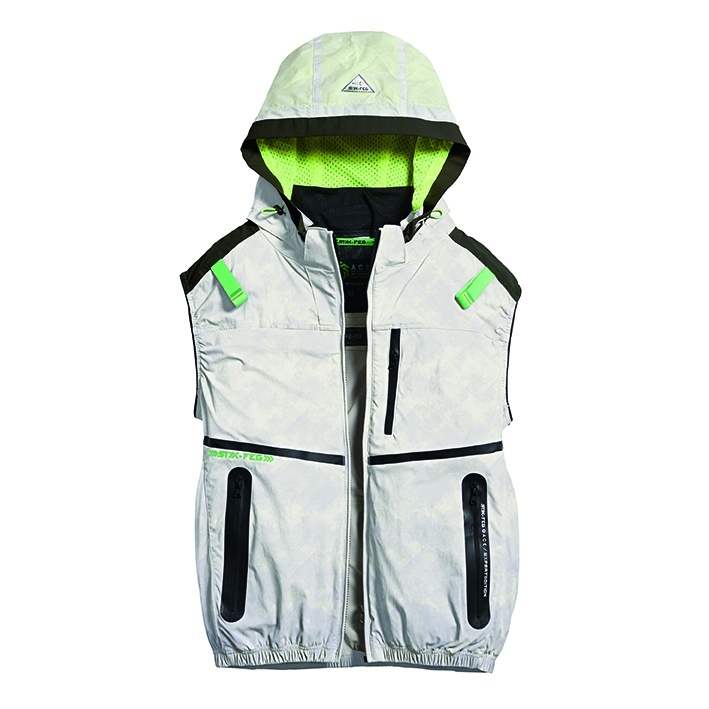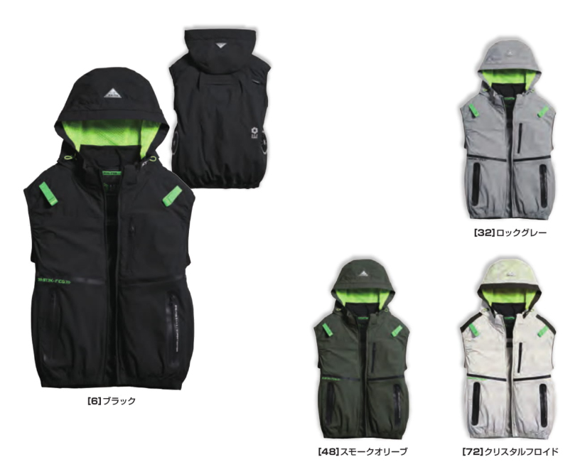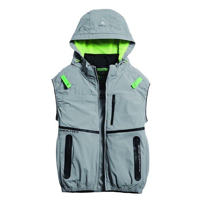 □デザイン:ベスト(フルハーネス対応)、サイドファン、着脱可能大型フード(スピンドル付)、右胸ブロックテーピーポケット、止水ファスナーポケット、両脇ファスナーポケット、背中アイスポケット、衿裏アイスポケット、ランヤード取付口