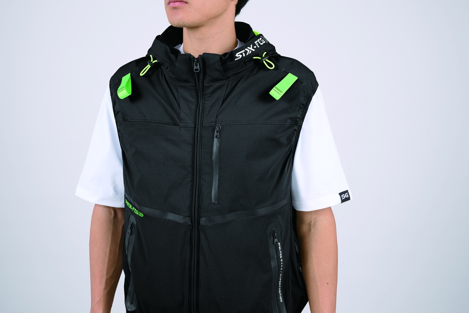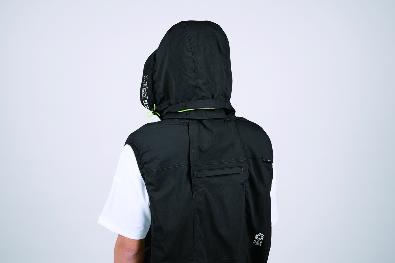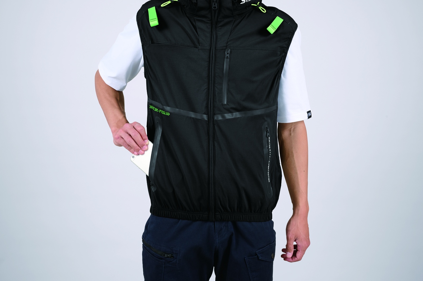 □デザイン:ベスト(フルハーネス対応)、サイドファン、着脱可能大型フード(スピンドル付)、右胸ブロックテーピーポケット、止水ファスナーポケット、両脇ファスナーポケット、背中アイスポケット、衿裏アイスポケット、ランヤード取付口