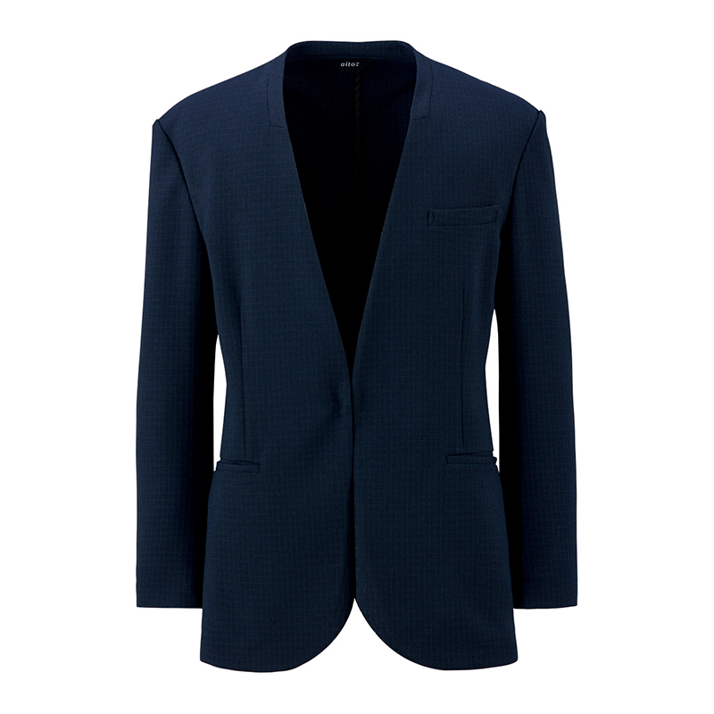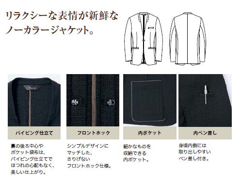【仕様】メンズジャケット、左胸ポケット、両脇ポケット、内ポケット(細やかなものを収納できる内ポケット)、パイピング仕立て、フロントホック、内ペン差し(身頃側には取り出しやすいペン差し付)