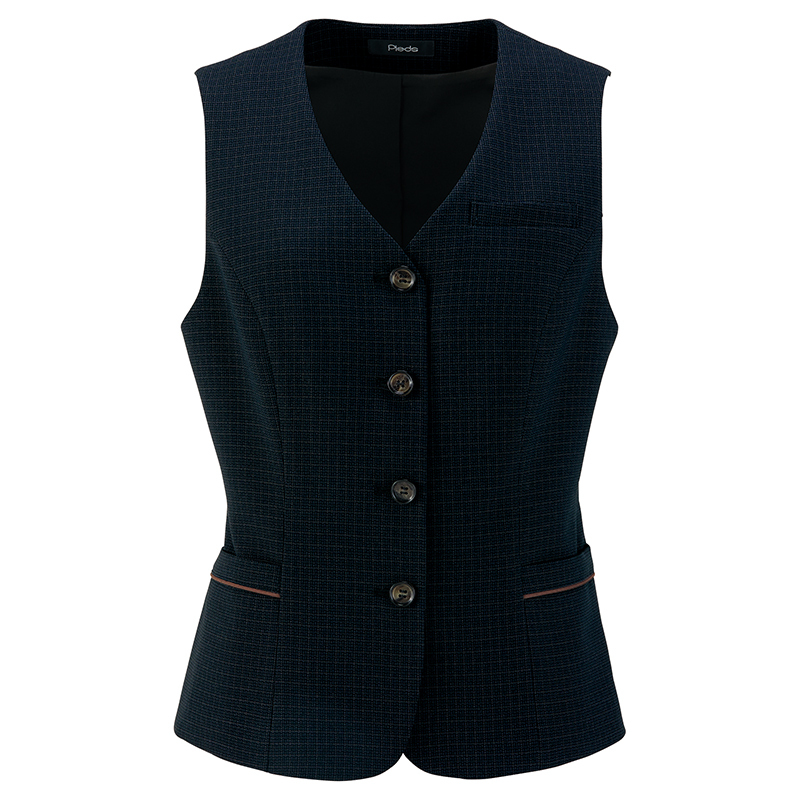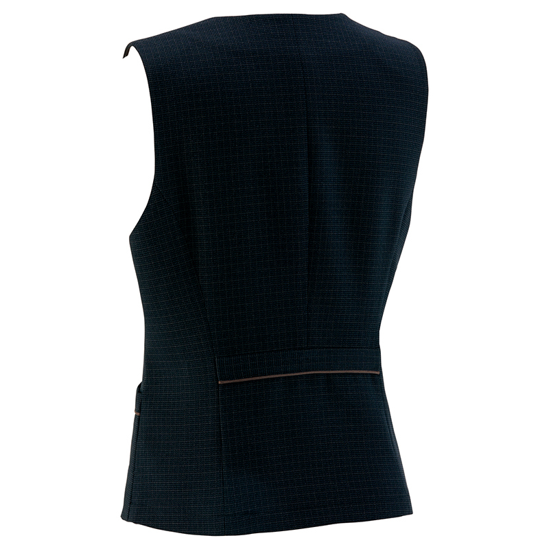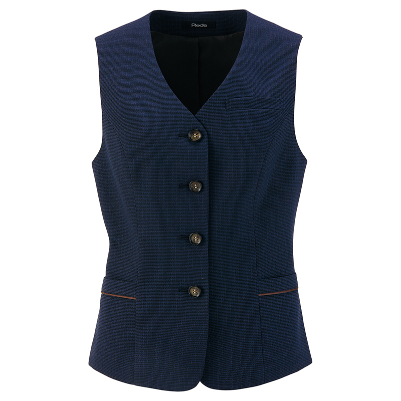 【仕様】レディースベスト、左胸ポケット、両脇ポケット、背中・ポケット配色パイピング、水牛調ボタン