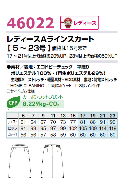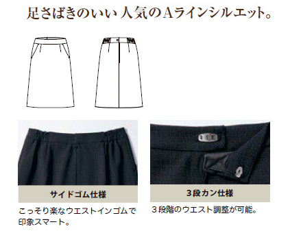 【仕様】レディーススカート、両脇ポケット、3段カン仕様(3段階のウエスト調節が可能)、サイドゴム仕様(こっそり楽なウエストインゴムで印象スマート)