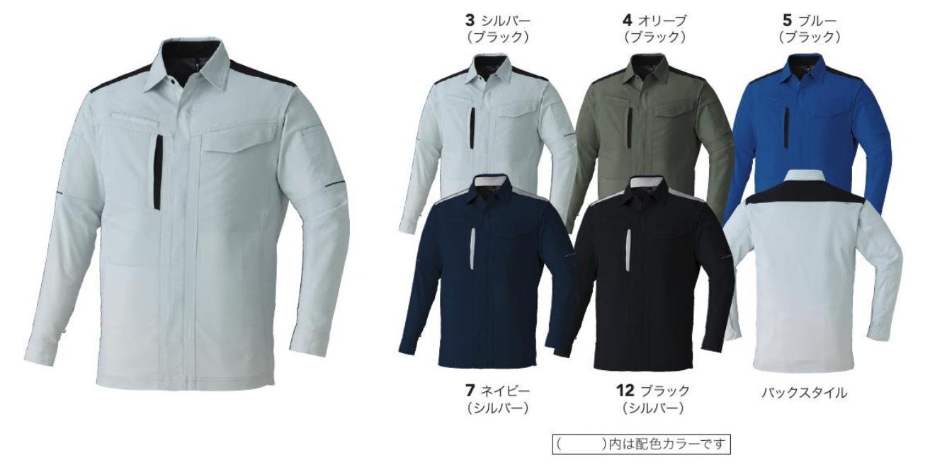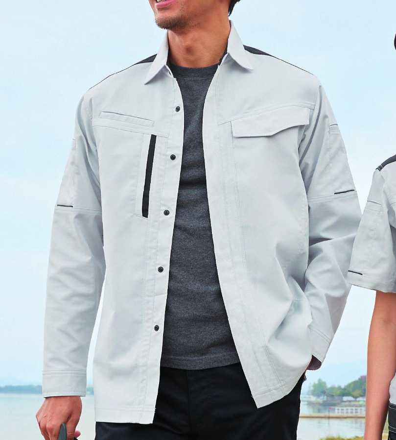 【仕様】長袖シャツ、背裏メッシュ仕様、両袖ペン差し付、左胸ペン差し付、右胸野帳対応ポケット、右胸マルチポケット、両袖切替反射パイピング、肘部分ダーツ付、片布付、ボタン(樹脂)、日本製生地