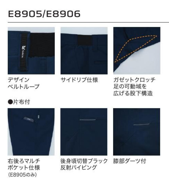 【仕様】ノータックパンツ、ベルトループ、サイドリブ仕様、ガゼットクロッチ(足の可動域を広げる股下構造)、右後マルチポケット仕様、後身頃切替反射パイピング、膝部ダーツ付、片布付、日本製生地