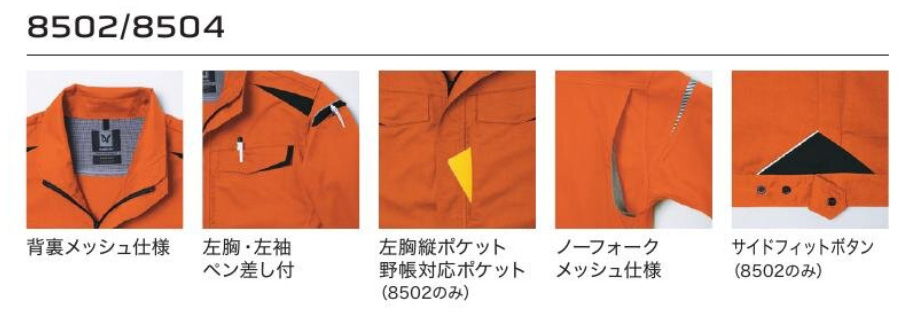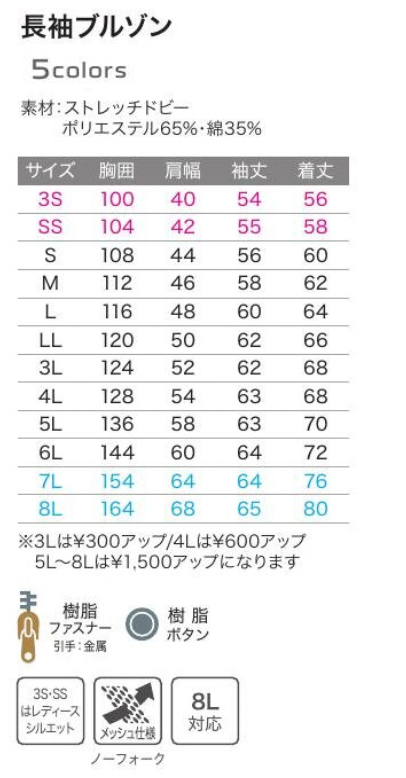 【仕様】長袖ブルゾン、背裏メッシュ仕様、左胸縦ポケット(野帳対応ポケット)、左胸・左袖ペン差し付、ノーフォークメッシュ仕様、サイドフィットボタン、樹脂ファスナー(引手:金属)、樹脂ボタン、日本製生地