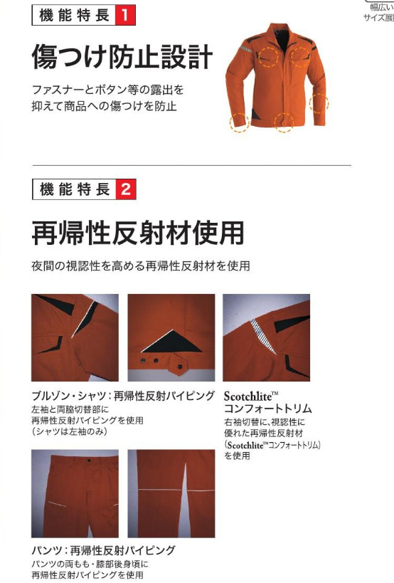 【機能】帯電防止素材、アゼック🄬ストレッチ、校倉構造の清涼素材、吸汗速乾、反射材、スリムシルエット