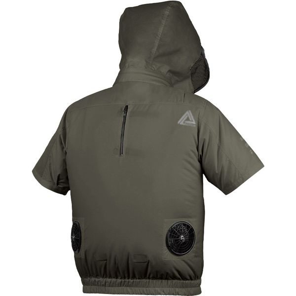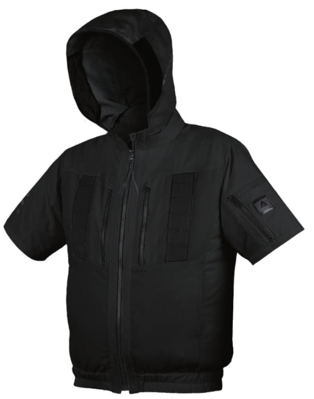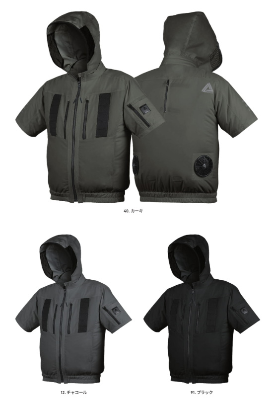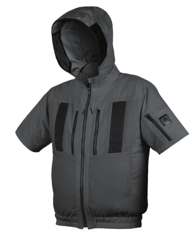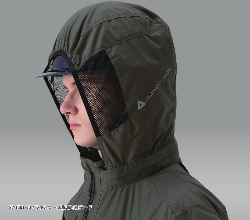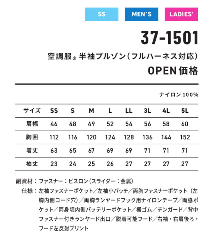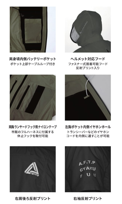 □ブルゾンデザイン:半袖ブルゾン、ヘルメット対応フード(ファスナー式脱着可能・反射プリント入り)、両身頃内側バッテリーポケット、両胸ランヤードフック用ナイロンテープ(市販のフルハーネスに付属する休止フックを取付可能)、両胸ポケット内側イヤホンホール、右肩後ろ・右袖反射プリント、左袖ファスナーポケット、両胸ファスナーポケット、両脇ポケット、裾ゴム、チンガード、背中ファスナー付きランヤード出口、ファスナー/ビスロン(スライダー/金属)