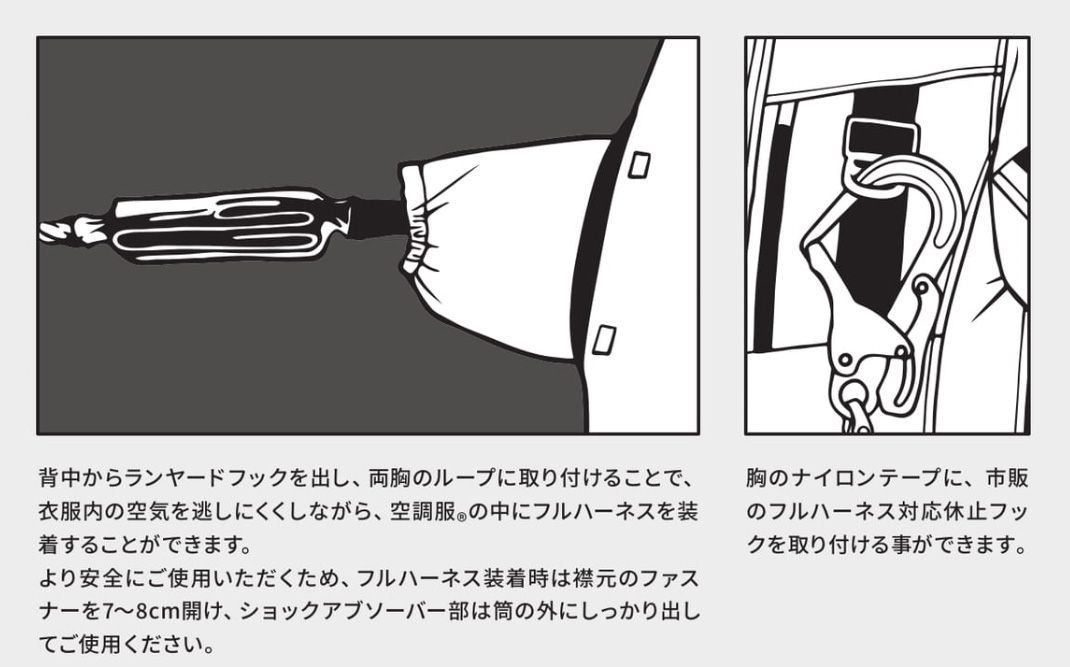 背中からランヤードフックを出し、両胸のループに取り付けることで、衣服内の空気を逃がしにくくしながら、空調服の中にフルハーネスを装着することができます。